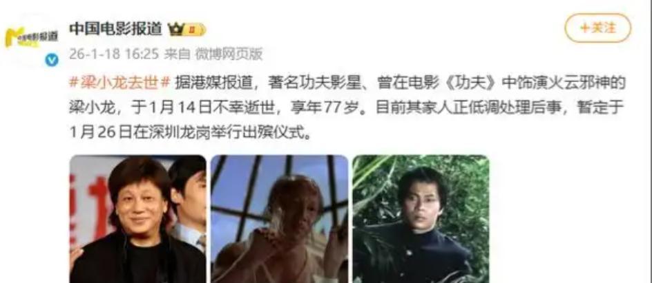 77岁的梁小龙走了,1月14日安安静静离开,葬礼定在1月26日深圳龙岗。消息一出,有人唏嘘,有人沉默——这位演过陈真、火云邪神的硬汉,真的不在了。 他和李小龙、成龙、狄龙并称“四小龙”,可他的路,从来不是靠谁捧起来的。15岁混武行,街头打架被看中,一脚踏进电影圈,拳脚干净利落,人也一样直。80年代初,《大侠霍元甲》《陈真》火遍内地,他成了家喻户晓的明星,结果一句“我是中国人”惹来三年封杀。