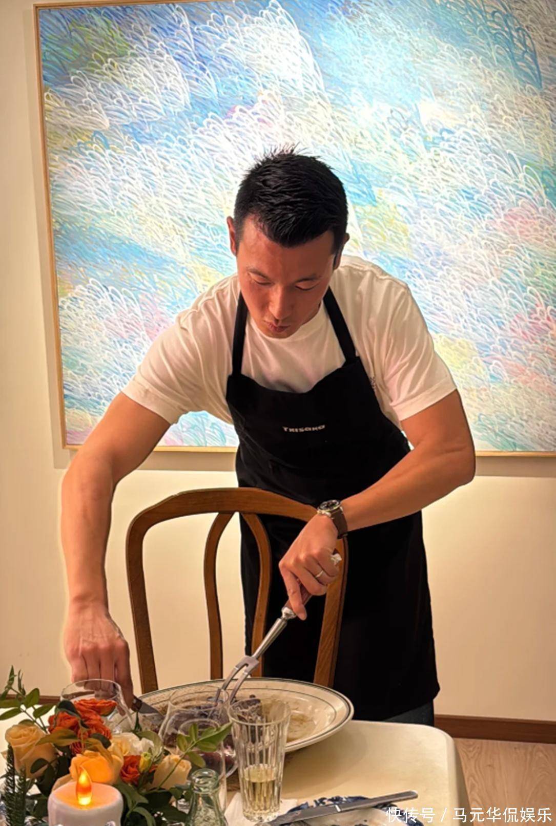 王昀佳照片里围了条黑围裙,穿白T恤切牛肉。网友都说他胳膊肌肉好看,一看经常锻炼。桌上摆了好几道菜,朱珠负责摆餐具放花,看起来挺高级。他们一共叫了十几个人来家里吃饭,朋友们都举着手机拍他做饭。